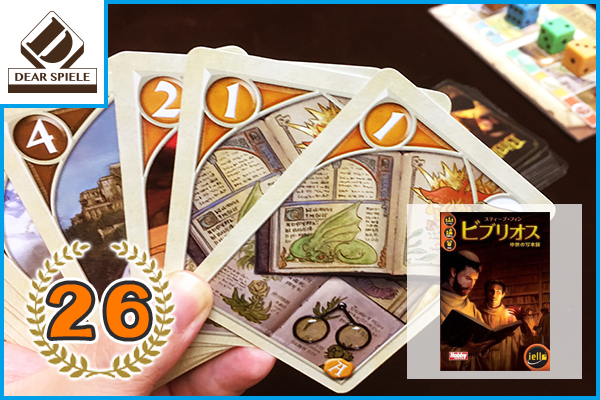 本をイメージした箱がいい感じ。(タイトルがギリシャ語で書物だもんね!)カラフルなサイコロを……振りません!カード効果で目を変えて価値を上げ下げし競りをしながらサイコロの獲得を目指すんですが、集めてる色がバレて価値を下げられたり、バチバチします(笑)コンパクトながら面白いゲーム☆